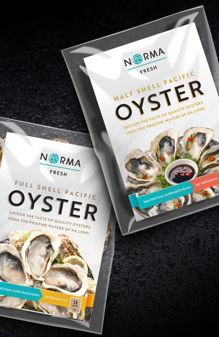 The first step was to craft a compelling logo and establish a captivating visual language that exuded freshness and vitality. The incorporation of cutlery served as a symbolic representation of NormaFresh’s diverse food verticals, starting with its first product of frozen oysters. A holistic approach ensured the brand’s ethos could be conveyed across the board delivering a deep sense of purpose and identity.